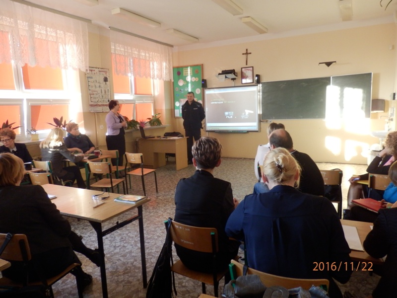 Wczoraj dzielnicowy gminy Sadowie przeprowadził spotkanie z nauczycielami tamtejszego Zespołu Szkół. Dotyczyło ono odpowiedniego zachowania się w sytuacji kryzysowej, czyli np. wtargnięcia napastnika do szkoły. Spotkania o takiej tematyce realizowane są na terenie całego powiatu opatowskiego.