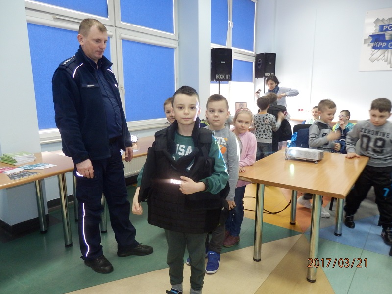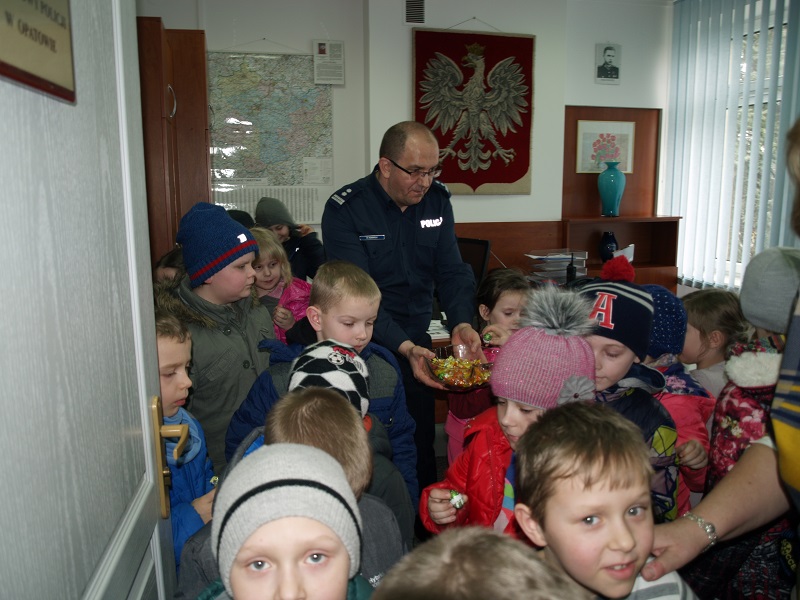 Odwiedzające grupy przyjął u siebie Komendant Powiatowy Policji w Opatowie mł. insp. Ryszard Komański, który odpowiadał na zadawane pytania przez dzieciaki i każdego uraczył słodkościami.
