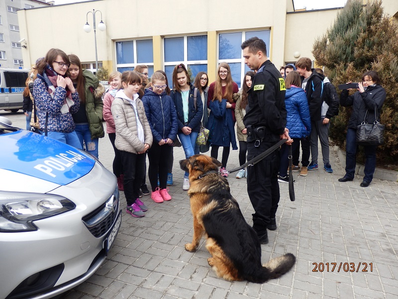 Na zakończenie wszystkie zwiedzające grupy spotkały się z przewodnikiem psa służbowego i zobaczyły jak pies ARGO reaguje i wykonuje polecenia swojego przewodnika. Mł.asp Arkadiusz Ścibór opowiadał zebranym jakie czynności wykonuje jego podopieczny podczas codziennej służby.
