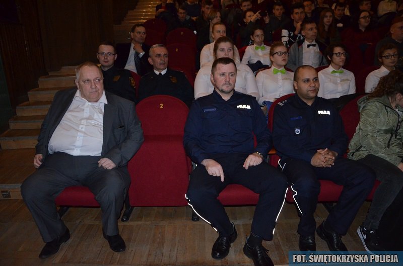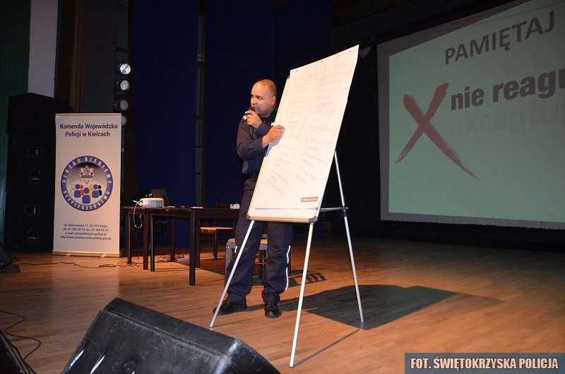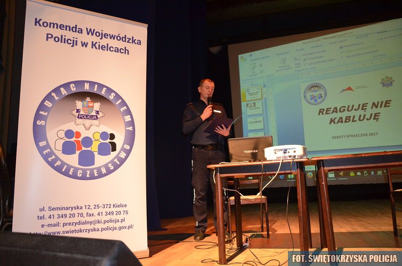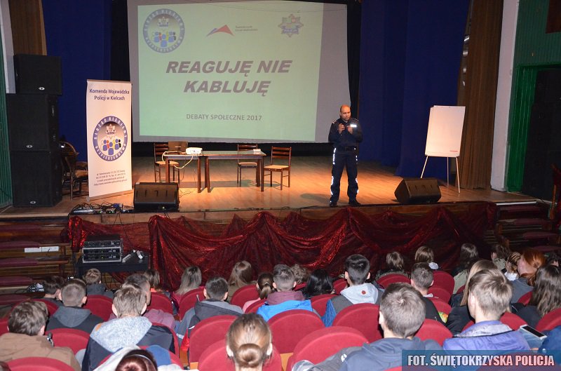 Dzisiaj w Opatowskim Ośrodku Kultury w Opatowie odbyła się kolejna powiatowa debata z młodzieżą „Reaguję – nie kabluję”. W ramach prowadzonej kampanii społecznej „Służąc Niesiemy Bezpieczeństwo”, realizowanej przez Komendę Wojewódzką Policji w Kielcach spotkania takie odbywają się w każdym z powiatów naszego województwa. Debatę prowadził Pełnomocnik Komendanta Wojewódzkiego Policji w Kielcach ds. Ochrony Praw Człowieka mł. insp. Gerard Bah.