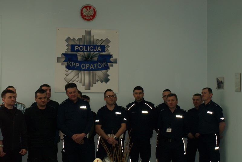 Zwyczajem w opatowskiej komendzie jest to, że tuż przed Świętami Wielkanocnymi wszyscy policjanci , pracownicy, a także goście są zaproszeni na świąteczny poczęstunek, aby tak jak w rodzinie złożyć sobie życzenia. W modlitwie stróżom prawa towarzyszył kapelan opatowskiej policji ks. Marek Łuszczyński. Gospodarze "jajeczkowego" spotkania, insp. Ryszard Komański wraz Zastępcą mł. insp. Andrzejem Skowrońskim, życzyli wszystkim, żeby święta upływały spokojnie w gronie najbliższych osób i były okazją do odpoczynku i refleksji. Życzenia spokojnych świat policjantom i pracownikom policji złożyli również zaproszeni goście Prokurator Rejonowy Renata Orłowska, Komendant Powiatowy Państwowej Straży Pożarnej kpt. mgr inż. Sylwester Kochanowicz oraz Prezes Zarządu w Opatowie Koła Stowarzyszenia Emerytów i Rencistów Policyjnych Dariusz Duda.