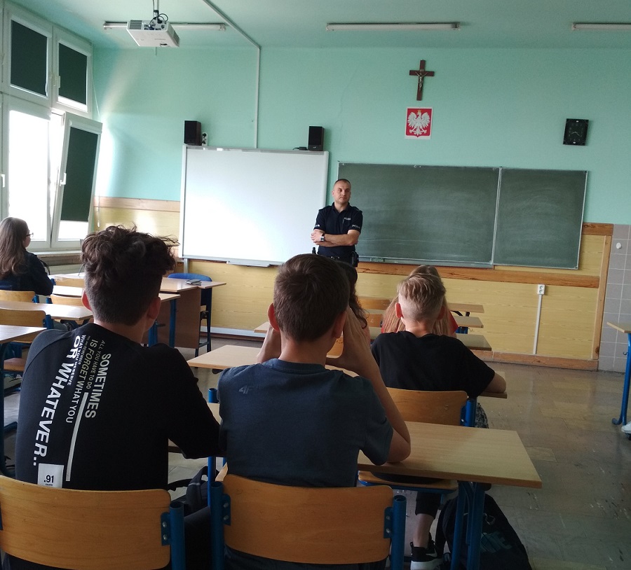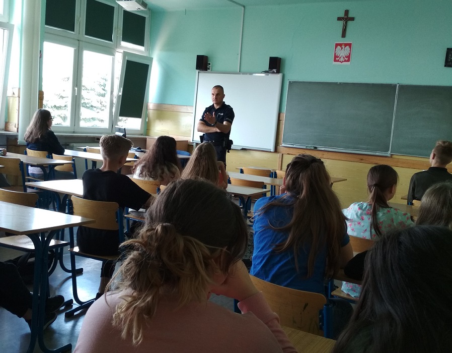 Dzielnicowy st. sierż. Piotr Sałata spotkał się z uczniami klas siódmych szkoły podstawowej im. E. Szylki w Ożarowie. Podczas spotkania opowiedział młodym ludziom o odpowiedzialności karnej nieletnich. Policjant przedstawił na jaką odpowiedzialność młodzi ludzie narażają się w przypadku wejścia w konflikt z prawem. Dzielnicowy przypomniał również o przepisach ruchu drogowego. Szczególna uwagę policjant zwrócił na zachowania rowerzystów.