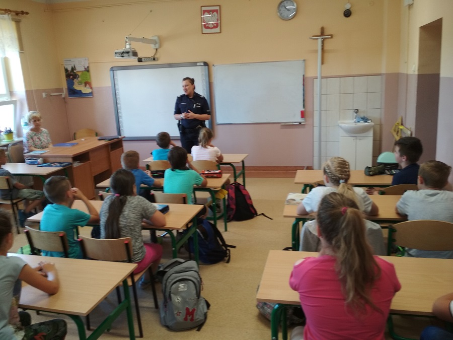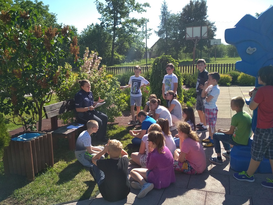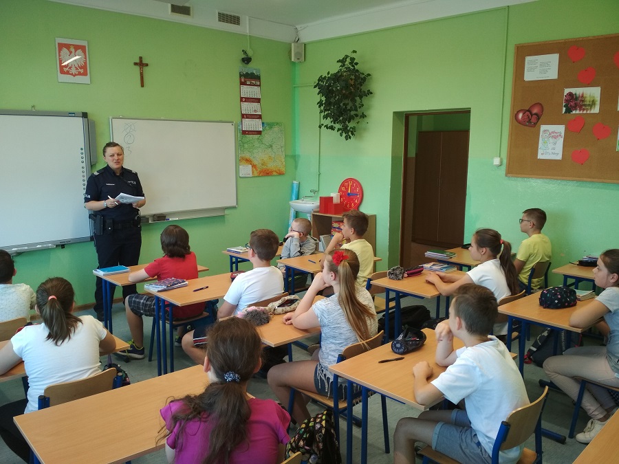 Po zakończonych egzaminach dzielnicowa przeprowadzała z młodzieżą prelekcje na temat bezpiecznego spędzania czasu wolnego podczas zbliżających się wakacji. Sierż. Szt. Katarzyna Czesna-Wójcik zwróciła uczniom uwagę na zachowanie bezpieczeństwa podczas wypoczynku nad wodą.