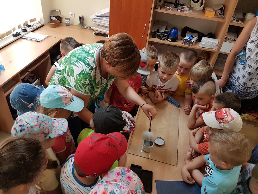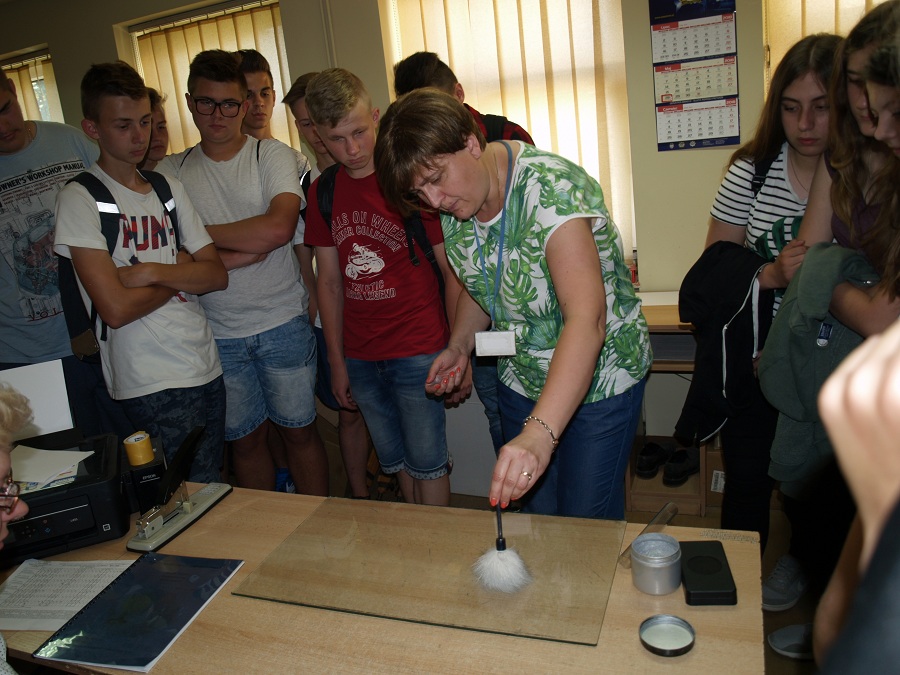 Dużym zainteresowaniem dzieci i młodzieży cieszyła się wizyta w pomieszczeniach technika kryminalistyki, gdzie wszystkie grupy chciały wiedzieć jak najwięcej na temat pracy, wykonywanych zadań oraz oczywiście ujawniania odcisków linii papilarnych.