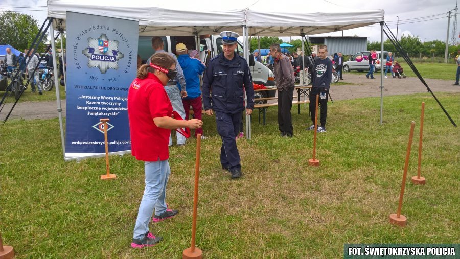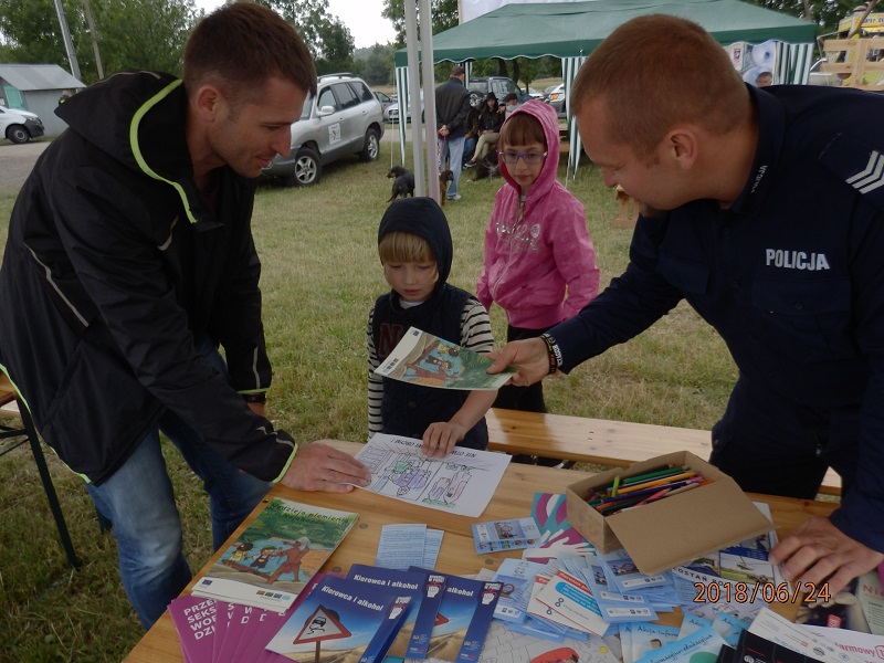 Starsi mogli się przekonać jak trudno w alkogoglach pokonać krótki slalom, a młodsi malowali kolorowanki, uczyli się zasad ruchu drogowego, numerów alarmowych i bezpiecznych zachowań podczas letniego wypoczynku. Dzieci, które wykazały się wiedzą na temat bezpieczeństwa, otrzymywały upominki. Wszystkie natomiast otrzymały kamizelki odblaskowe, a dorośli odblaski.