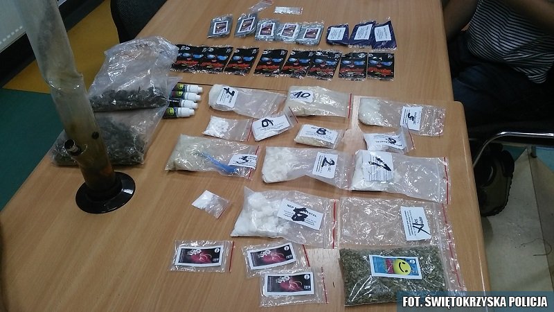 Podczas sprawdzenia pomieszczeń należących do 36-letniego mieszkańca gminy Ożarów policjanci ujawnili ponad 300 gramów dopalaczy w postaci białego proszku i kryształków. Dodatkowo funkcjonariusze zabezpieczyli 17 opakowań suszonego ziela, które wstępnie zostało określone jako marihuana oraz dopalacz. W sumie kryminalni zabezpieczyli około 440 gramów zakazanych specyfików, które nie trafią na rynek.