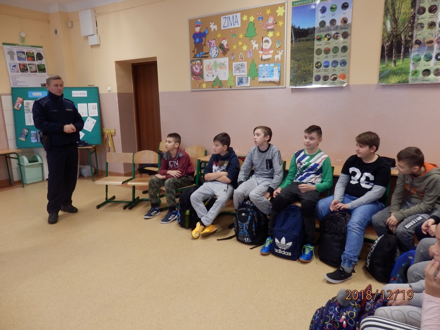 Dzielnicowy rozmawiał również z młodymi ludźmi o właściwym zachowaniu, a także przybliżył im tematykę odpowiedzialności prawnej osób nieletnich za popełnione czyny karalne. Uczniowie dowiedzieli się także, jakie zachowania są przejawami demoralizacji i jak powinni się zachowywać na terenie szkoły.