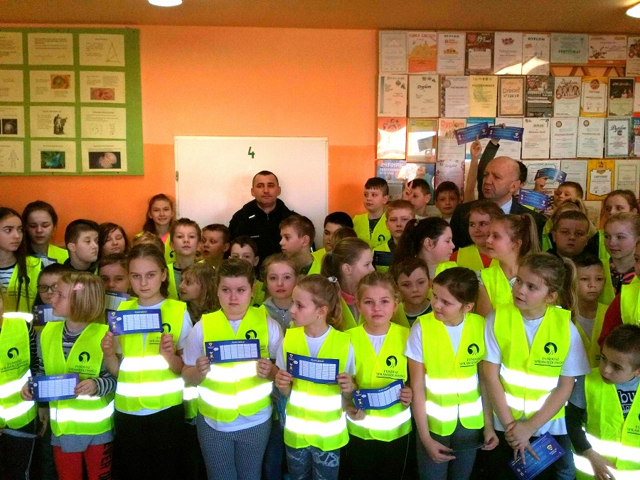 St. asp. Radosław Krakowiak przypomniał najmłodszym, że odblaski powinni nosić zawsze kiedy poruszają się po zmroku. Dzięki nawet małemu elementowi, kierowca, który jedzie po zmroku, już ze znacznej odległości zauważy dziecko, zmniejszając tym samym ryzyko wypadku. Na zakończenie spotkania uczniowie otrzymali kamizelki odblaskowe, zakupione z Funduszu Sprawiedliwości, w ramach kampanii „Dobrze Cię Widzieć”