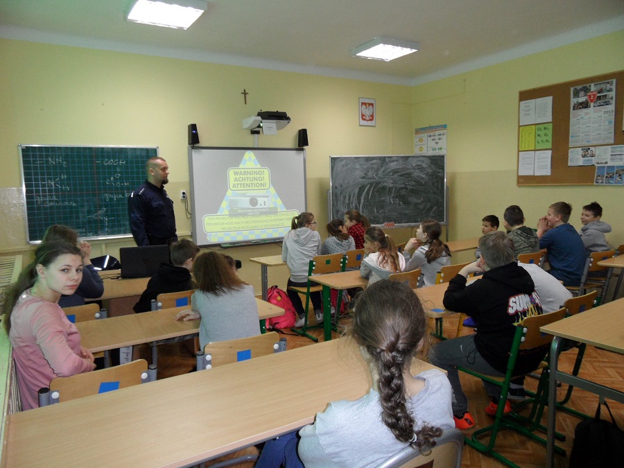 Dzielnicowi mł. asp. Łukasz Nowak i mł. asp. Konrad Ozdoba spotkali się z siódmoklasistami ze Szkoły Podstawowej w Tarłowie. Podczas spotkania policjanci rozmawiali z młodzieżą o zagrożeniach płynących z sieci internetowej, przede wszystkim o cyberprzemocy. Mundurowi wyjaśniali również dlaczego nie należy zamieszczać w sieci swoich danych osobowych oraz przedstawiali zagrożenia płynące z beztroskiego zawierania tam znajomości. Dzielnicowi zapoznali również siódmoklasistów z konsekwencjami prawnymi młodzieży dopuszczającej się przestępstw i wykroczeń, w tym również za pomocą Internetu.
