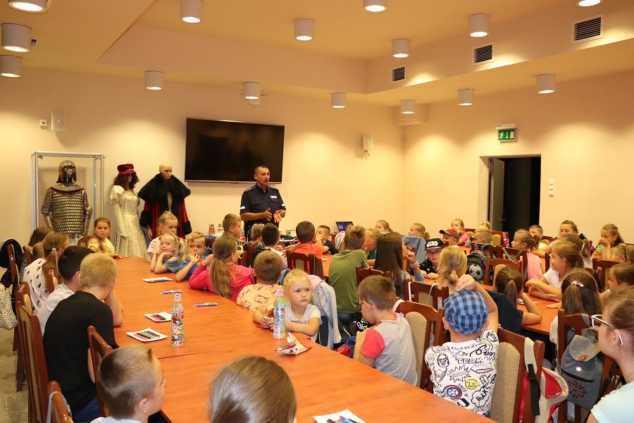 Dziś opatowscy policjanci odwiedzili dzieci uczestniczące w półkoloniach na Zamku w Ujeździe. Mundurowi przypomnieli wypoczywającym najważniejsze zasady bezpieczeństwa podczas wakacyjnego wypoczynku.