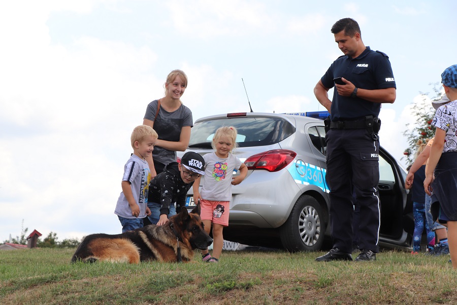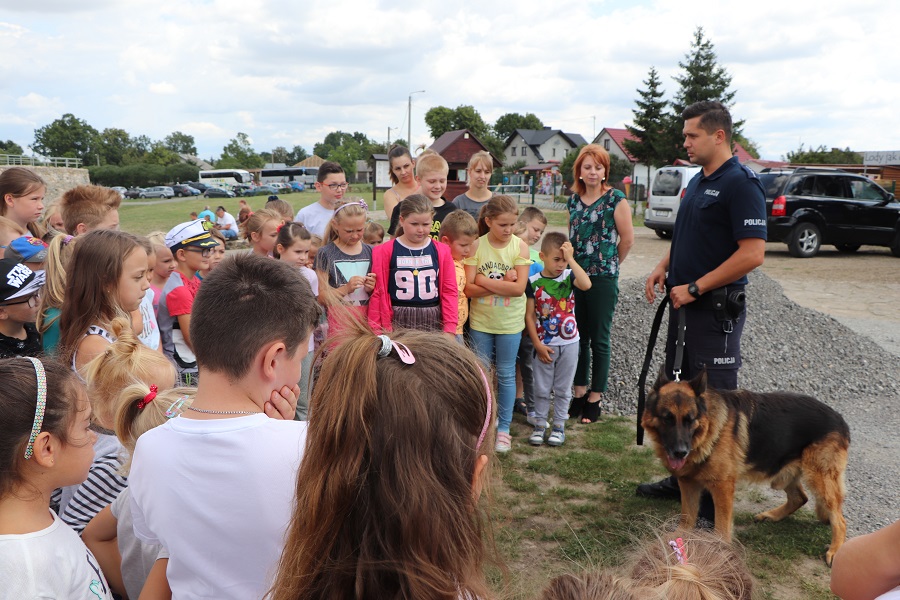 Dziś dzielnicowy gminy Iwaniska asp. szt. Radosław Krakowiak, asp. Arkadiuszem Ścibór – przewodnik psa służbowego oraz policjanci Wydziału Prewencji opatowskiej komendy odwiedzili dzieci na półkoloniach trwających na Zamku Krzyżtopór w Ujeździe. Dzielnicowy przypomniał maluchom jak poruszać się prawidłowo po drogach, jak bezpiecznie spędzać czas wolny w domu i co zrobić w przypadku, gdy jest się zaczepianym przez osobę obcą. Wiele osób latem odpoczywa nad wodą, dlatego ważnym tematem do rozmowy było bezpieczeństwo w rejonie akwenów i przy korzystaniu z różnego rodzaju wodnych atrakcji. Policjanci dla maluchów przygotowali również kilka atrakcji. Jedną z nich było spotkanie z asp. Arkadiuszem Ściborem. Policjant - przewodnik owczarka niemieckiego opowiadał maluchom na czym polega praca z policyjnym psem, jakie zwierzak musi przejść szkolenia i do czego może być wykorzystany. Policjant opowiedział dzieciom jak bezpiecznie postępować ze zwierzętami i jak się zachować w przypadku ataku. Natomiast dzieci wykazały się znajomością zachowań w przypadku ataku niebezpiecznego zwierzęcia. Policjant przypomniał również maluchom jak należy dbać o swoje zwierzęta.