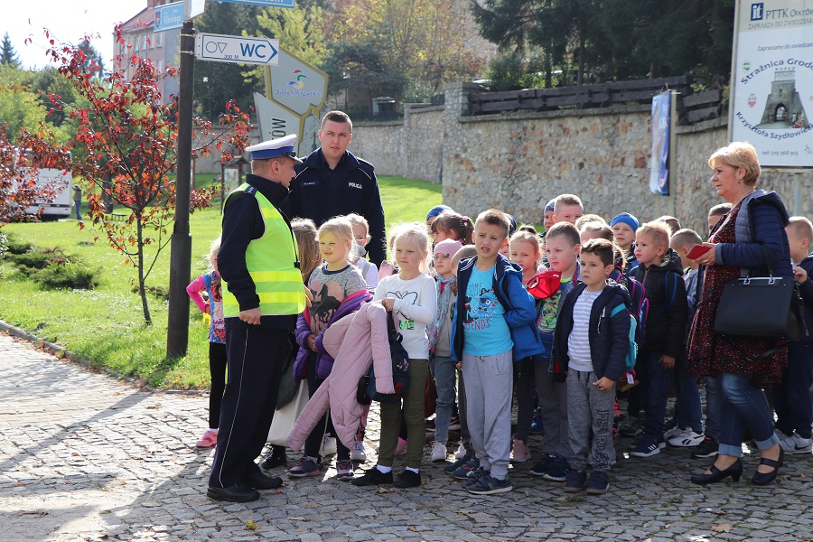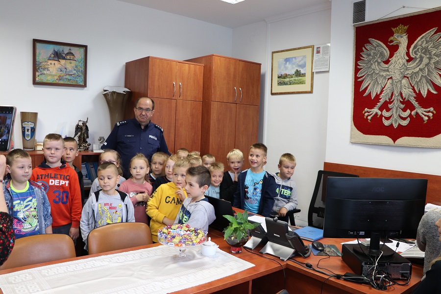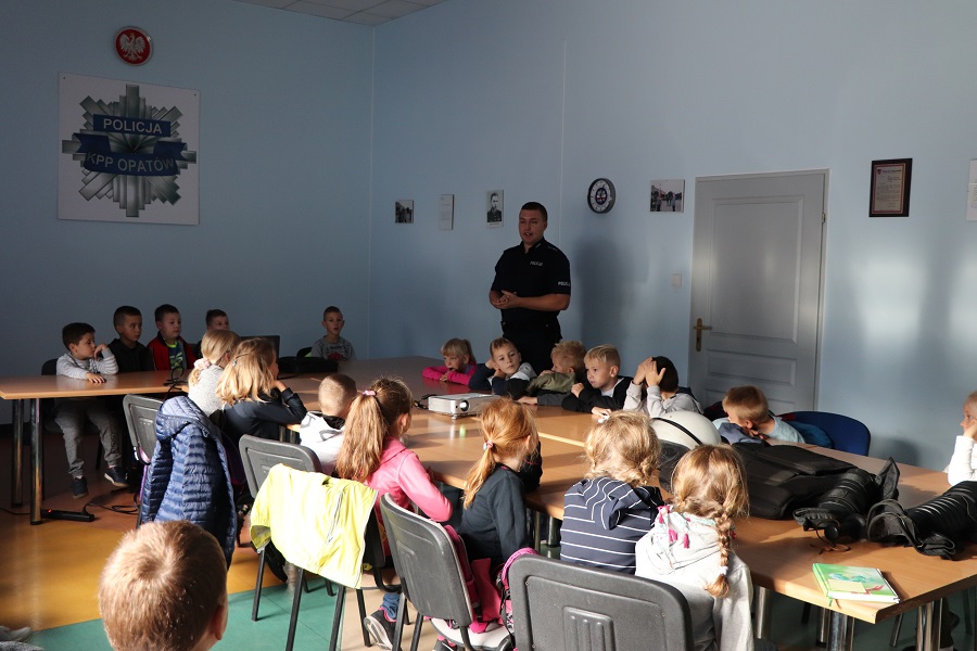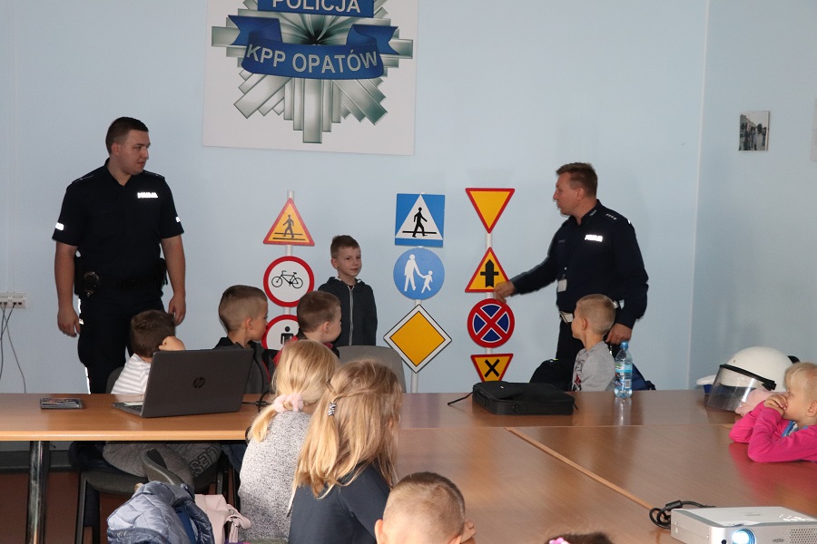 Zajęcia poświęcone bezpieczeństwu najmłodszych mieszkańców naszego powiatu na stałe wpisanie są w działania opatowskich policjantów. Dzisiaj do Opatowa przyjechali pierwszoklasiści z Sadowia. Maluchy pierwsze kroki skierowali do Komendy Powiatowej Policji w Opatowie. Tu młodzi ludzie dowiedzieli się o pracy opatowskich stróżów prawa. Podczas pogadanki Naczelnik Wydziału Ruchu Drogowego nadkom. Andrzej Kolera i dzielnicowy mł. asp. Mateusz Papaj przypomnieli maluchom zasady bezpiecznego poruszania się po drogach, a w szczególności bezpiecznego przechodzenia przez jezdnię. Nie zabrakło również informacji o konieczności noszenia elementów odblaskowych. W czasie spotkania w komendzie najmłodsi zobaczyli sprzęt i wyposażenie policyjne. Małych gości w swoim gabinecie przyjął również szef opatowskich policjantów Komendant Powiatowy insp. Ryszard Komański.