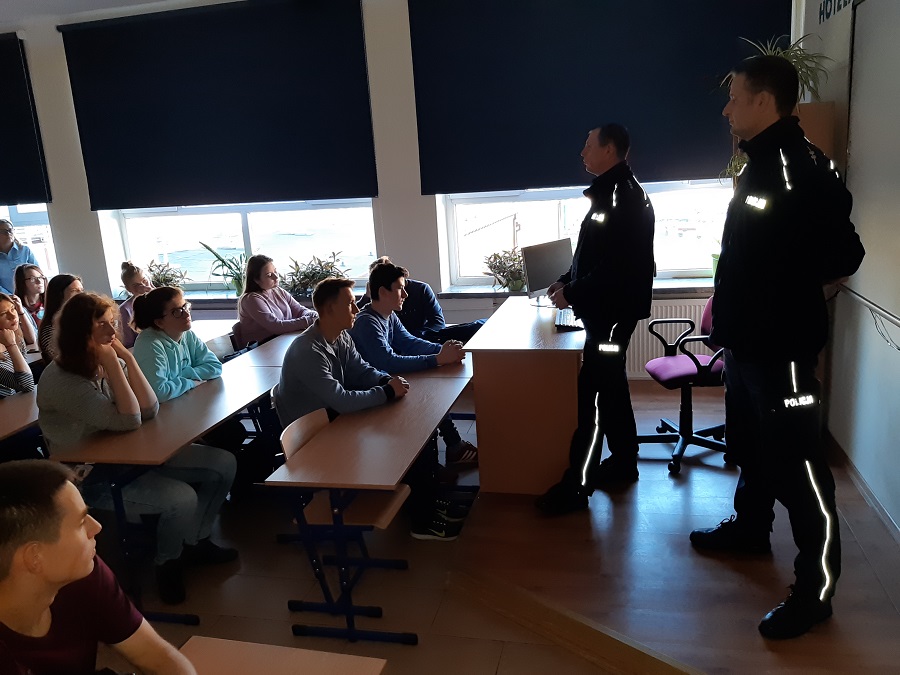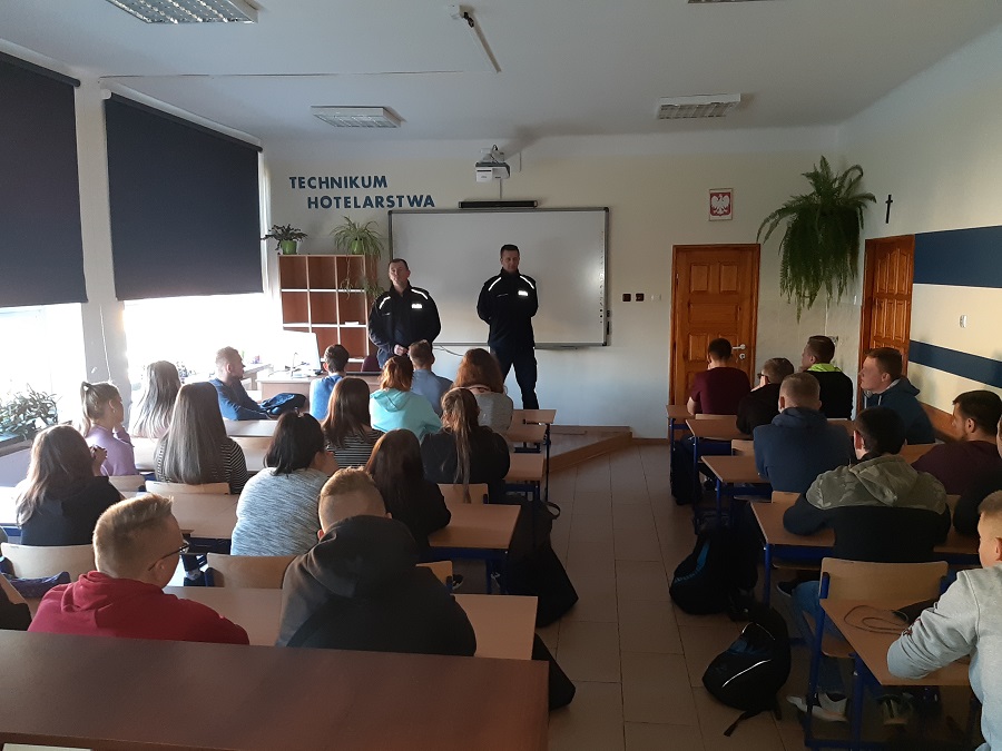 Spotkanie z młodymi uczniami szkoły średniej odbyło się w ramach akcji informacyjno-edukacyjnej pn. „Nie zabijaj – Jedź bezpiecznie!”. Podczas spotkania z asystentem Wydziału Ruchu Drogowego asp. Krystianem Krzyżanowskim i kierownikiem Rewiru Dzielnicowych asp. szt. Grzegorzem Rusakiem młodzi ludzie mieli okazję pogłębić swoją wiedzę dotyczącą bezpieczeństwa w aspekcie właściwych oraz negatywnych zachowań wpływających na bezpieczeństwo w ruchu drogowym. Policjanci poruszyli tematy dotyczące zarówno bezpieczeństwa kierujących, pasażerów, jak również pieszych. Mundurowi przypomnieli słuchaczom o obowiązku korzystania z pasów bezpieczeństwa podczas podróży samochodem oraz o konsekwencjach prawnych i społecznych związanych z kierowaniem samochodem po alkoholu.