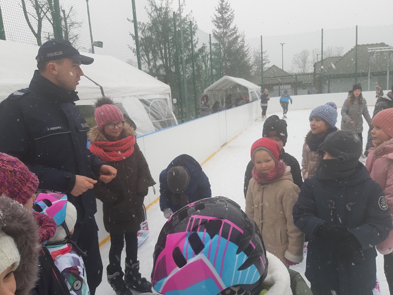 W pierwszym tygodniu ferii opatowski dzielnicowy sierż. szt. Adam Kędziora odwiedził dzieciaki spędzające czas wolny w zespole szkól nr1 oraz na sztucznym lodowisku w Opatowie. Policjant podczas spotkania rozmawiał z dziećmi o bezpiecznych zachowaniach na drodze i prawidłowym przechodzeniu przez jezdnię. Funkcjonariusz przypomniał o zagrożeniach czyhających na dzieci w trakcie ferii zimowych. Przestrzegał przed ślizganiem się na skutych lodem jeziorach, stawach i rzekach, a także przed zjeżdżaniem z górek znajdujących się blisko ruchliwych ulic.