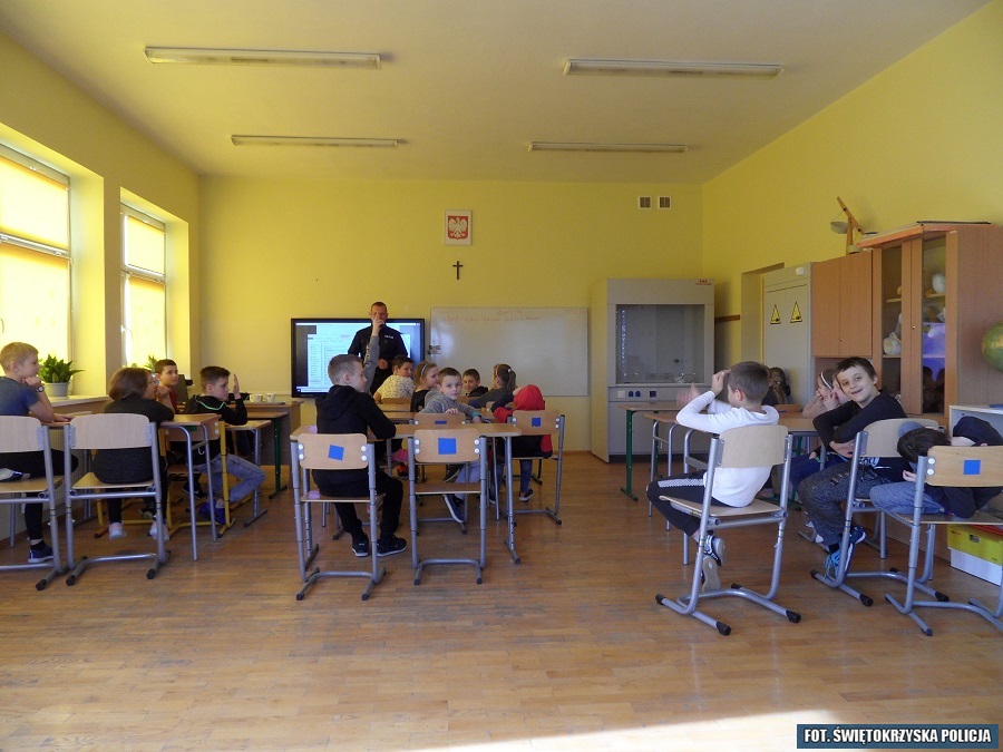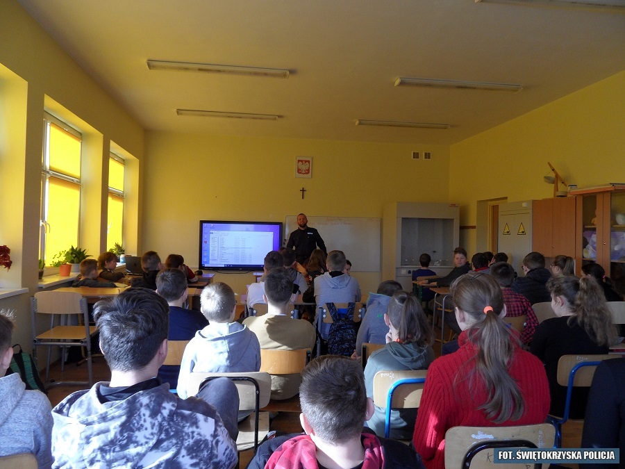 Z uczniami klas starszych mł. asp. Konrad ozdoba poruszył problematykę przeciwdziałanie agresji i przemocy. Młodzi ludzie dowiedzieli się czym jest dyskryminacja rówieśnicza, jak radzić sobie z agresją, rozwiązywać konflikty a także co należy zrobić, gdy sami jej doświadczą. Istotnym elementem zajęć było uświadomienie młodym ludziom jak ważne jest zgłaszanie osobom dorosłym przypadków przemocy, a tym samym nie pozostawianie ofiar bez pomocy. Podczas prowadzonych pogadanek policjant wskazywał na czyny karalne, przestępstwa i wykroczenia popełniane przez młodych ludzi z użyciem agresji i przemocy i przestrzegał przed konsekwencjami negatywnych zachowań.