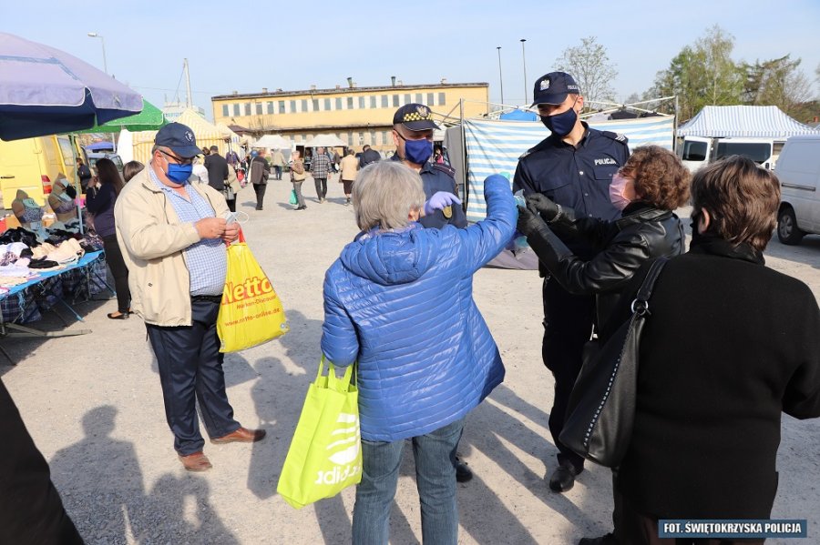 Policjanci z Komendy Powiatowej Policji w Opatowie w trosce o zdrowie mieszkańców, i jednocześnie przypominając o obowiązku zakrywania ust i nosa w przestrzeni publicznej rozdają maseczki ochronne.