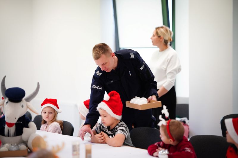 W drugiej części wizyty dzieci, wspólnie z Komendantem Powiatowym Policji w Opatowie insp. Rafałem Zielińskim oraz jego Pierwszym Zastępcą nadkom. Ewą Pardałą, malowały bombki choinkowe oraz tworzyły ozdoby świąteczne. Powstałe ozdoby trafią na świąteczny kiermasz charytatywny, z którego dochód zostanie przeznaczony na pomoc małej Amelce Wiatrowskiej. Twórcza atmosfera i wspólna praca sprawiły najmłodszym dużo radości, a policjantom dała okazję do budowania pozytywnych relacji z lokalną społecznością.