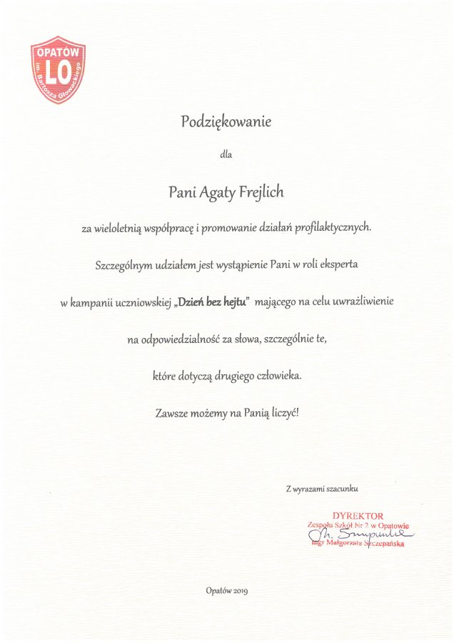 Podziękowania od Zespołu Szkół nr 2 w Opatowie- Dzień bez hejtu