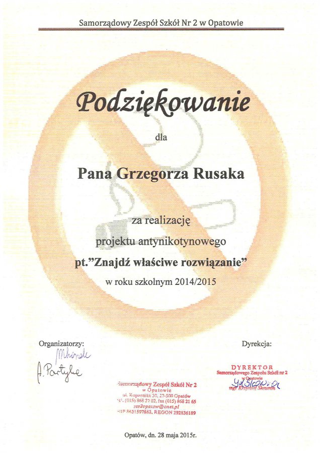 Podziękowanie za realizację projektu antynikotynowego