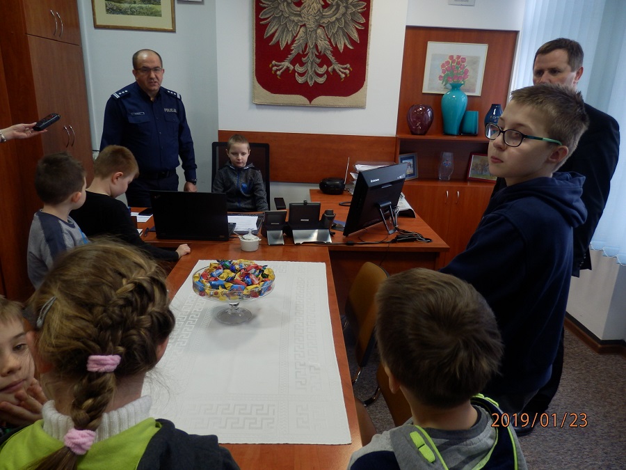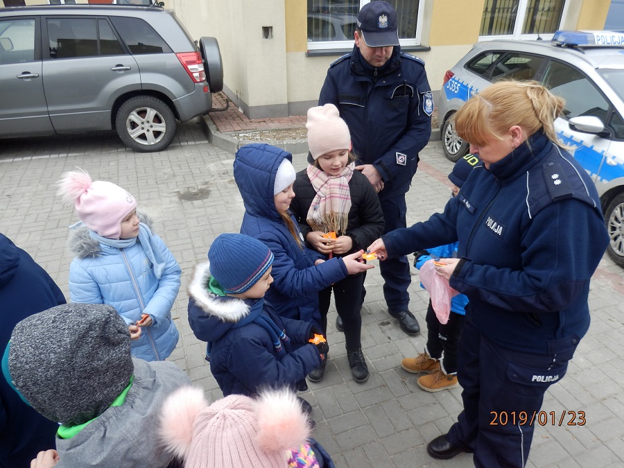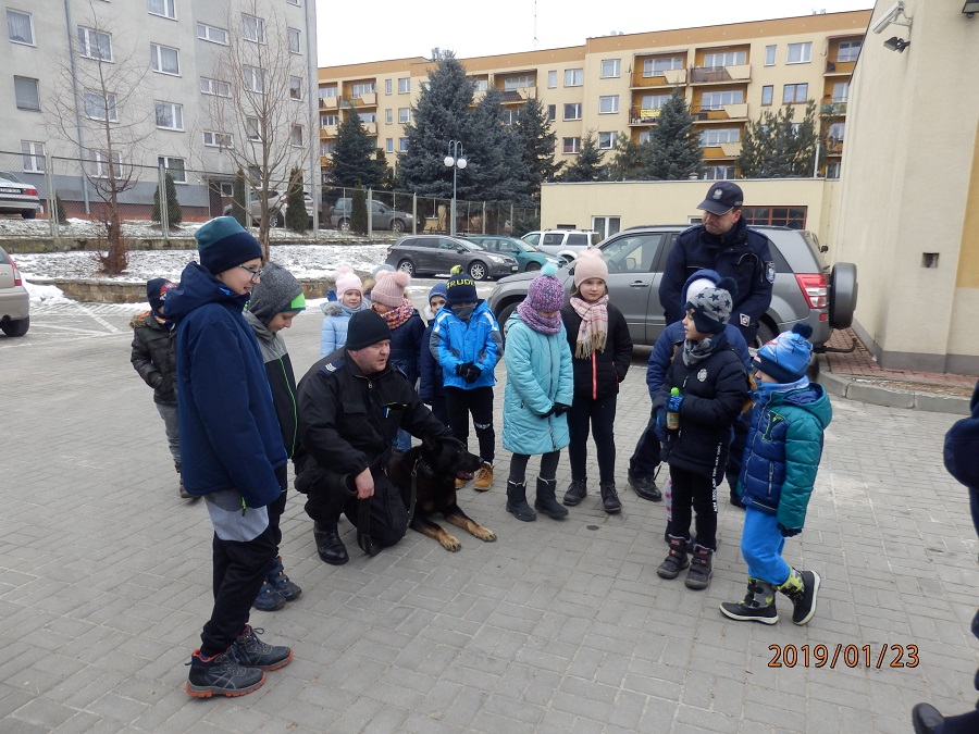Ferie już na finiszu. Opatowscy policjanci w ciągu tego czasu dbali aby dzieci spędzały wolne dni bezpiecznie i zachowały miłe wspomnienia, kiedy przyjdzie im wrócić do szkół. Wczoraj na zaproszenie dzielnicowego asp. Krzysztofa Pietrzyka miejscową komendę odwiedziły maluchy z Opatowskiego Ośrodka Kultury. W Sali narad dzieci dowiedziały się jak wygląda praca policjanta oraz struktura i funkcjonowanie opatowskiej komendy. Policjanci przedstawili im również sylwetkę patrona świętokrzyskiej policji mjr. Jana Piwnika „Ponurego”. Odwiedzających komendę do swojego gabinetu zaprosił Komendant Powiatowy Policji w Opatowie insp. Ryszard Komański, który odpowiadał na zadawane mu pytania. Maluchy miały możliwość poczuć się jak komendant, siadając w jego fotelu. Na zakończenie wizyty maluchy otrzymały od komendanta słodkości. Zwiedzając budynek komendy mali goście zapoznali się również z pacą dyżurnego. Kom. Andrzej Kolera przedstawił maluchom jak wygląda stanowisko kierowania i jakie informacje należy podać dzwoniąc na numer alarmowy. Jednak największą atrakcją było zapoznanie się z czworonożnym „funkcjonariuszem”. Sierż. szt. Paweł Wasiński opowiedział o pracy z psem policyjnym. Zwrócił również dzieciom uwagę jak mają dbać o swoje zwierzęta, zwłaszcza w te bardzo zimne dni. Podczas spotkania każdy mógł pogłaskać policyjnego czworonoga i zrobić sobie z nim zdjęcie. Na zakończenie wizyty dzieci otrzymały od policjantów kolorowe odblaski.